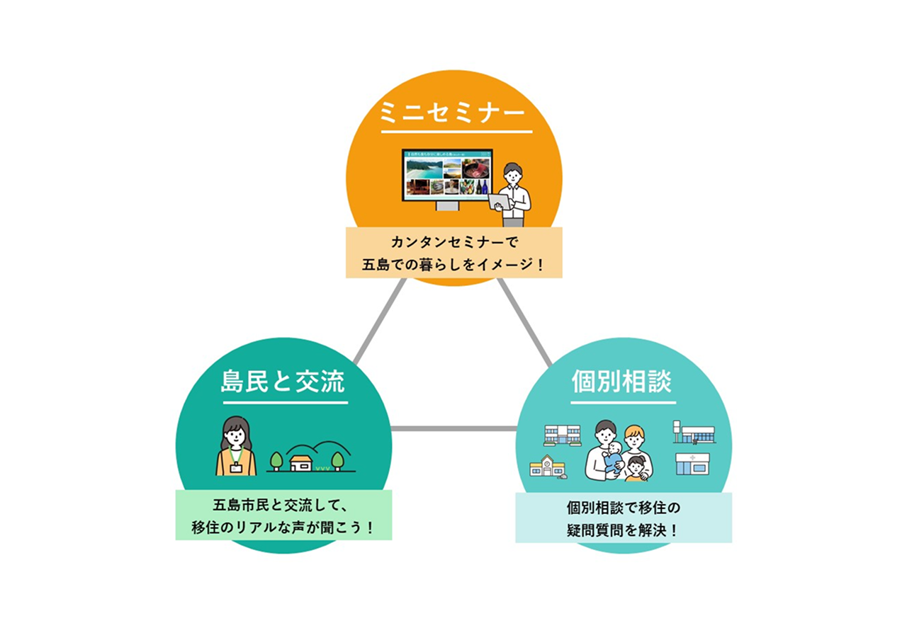 五島列島の美しい風景や文化、おいしい特産品を体感できる観光PRコーナー、五島産品の販売、そして、島暮らしミニセミナー、島民との交流、個別相談など、五島市での暮らしをイメージできる企画が盛りだくさん!
