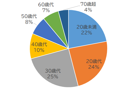全体の約70%が30代までの若者世代です。