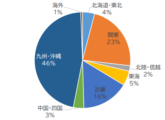 約半数が九州・沖縄から、約4分の1が関東から来られています。そして近畿、東海、北海道・東北と続きます。