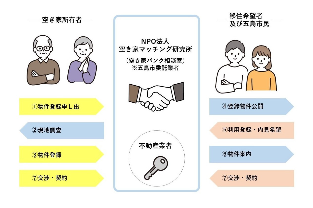 | 4 | 内見 | 利用希望者からの要望により、空き家の内見を行います。日程調整後、所有者または管理者の立会いのもと内見を行います。 注:空き家の鍵は物件登録者で管理していただきます。 |